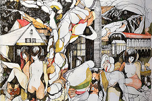 Du kennst das Gefühl, allein unterwegs zu sein, in Gedanken versunken? Doch plötzlich stellst du fest, dass dir seltsame Kreaturen folgen, Fabelwesen dich anschauen oder Frauengestalten dich stumm beobachten. Du schaust dich um und siehst nur welke Blätter an knorrigen, verwurzelten Ästen winken. Regen tropft leise auf die Blätter am Boden und legt die feinen, schmalen Glieder einer Hand frei. Es werden mehrere liegend ineinander verschlungene Körper deutlich sichtbar. Scheinbar hunderte Arme und Beine liegen verknotet im Gras.