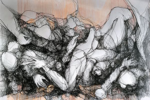 Er sehe „Drachen und Ritter“ zwischen den Linien, so Reinhard Geller, der zweite Vorsitzende des Kunstvereins, über die Zeichnungen.